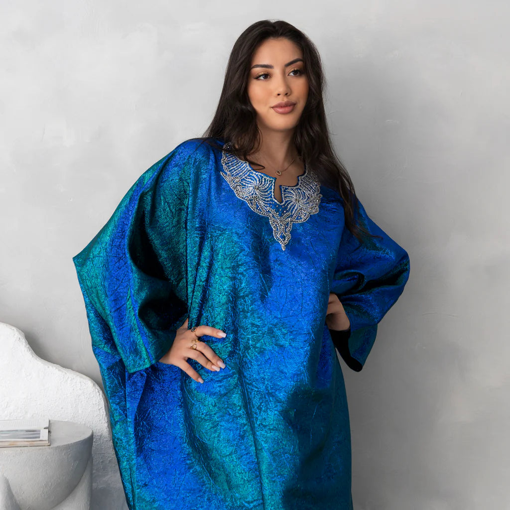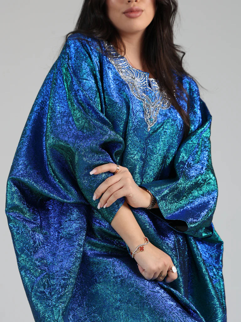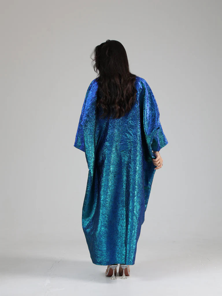Crafted from luxurious smokey organza, its blend of blue and green hues creates a graceful, ethereal effect — ideal for special occasions or refined evening wear.