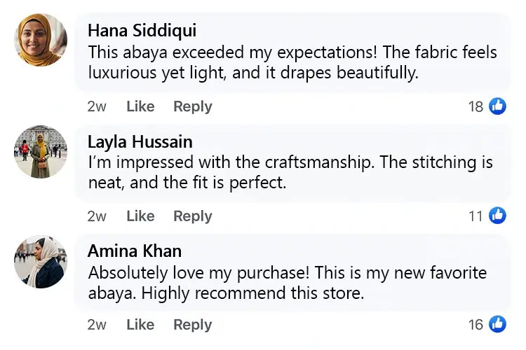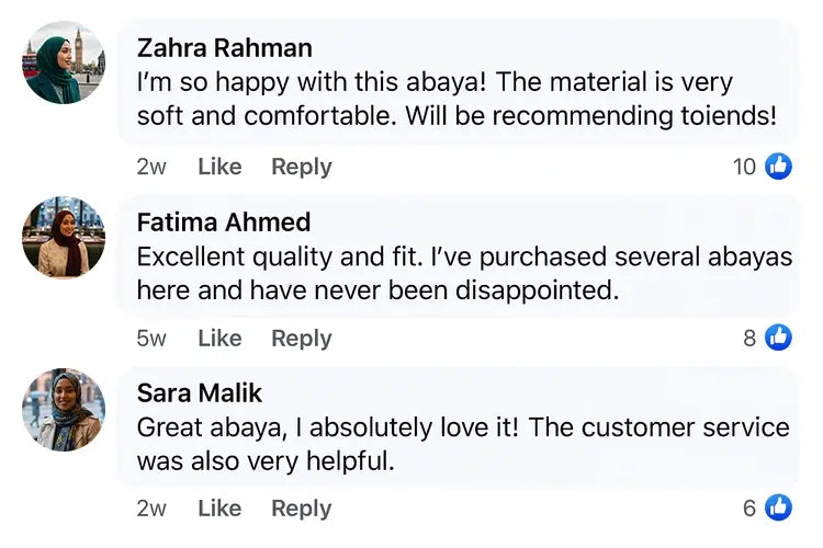 • I’m so impressed with the quality and attention to detail. The stitching is flawless and the material is lightweight yet opaque - perfect for everyday wear. Delivery was quick and the packaging felt very premium. It’s rare to find an abaya this elegant at such a fair price!